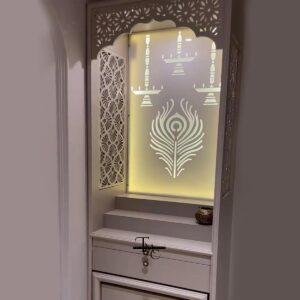 Modern Corian mandir design is preferred for its elegance, durability and unmatched versatility. The fine craftsmanship, sleek finish and intricate jali give a pooja mandir a premium look that everyone deserves for their home or office.